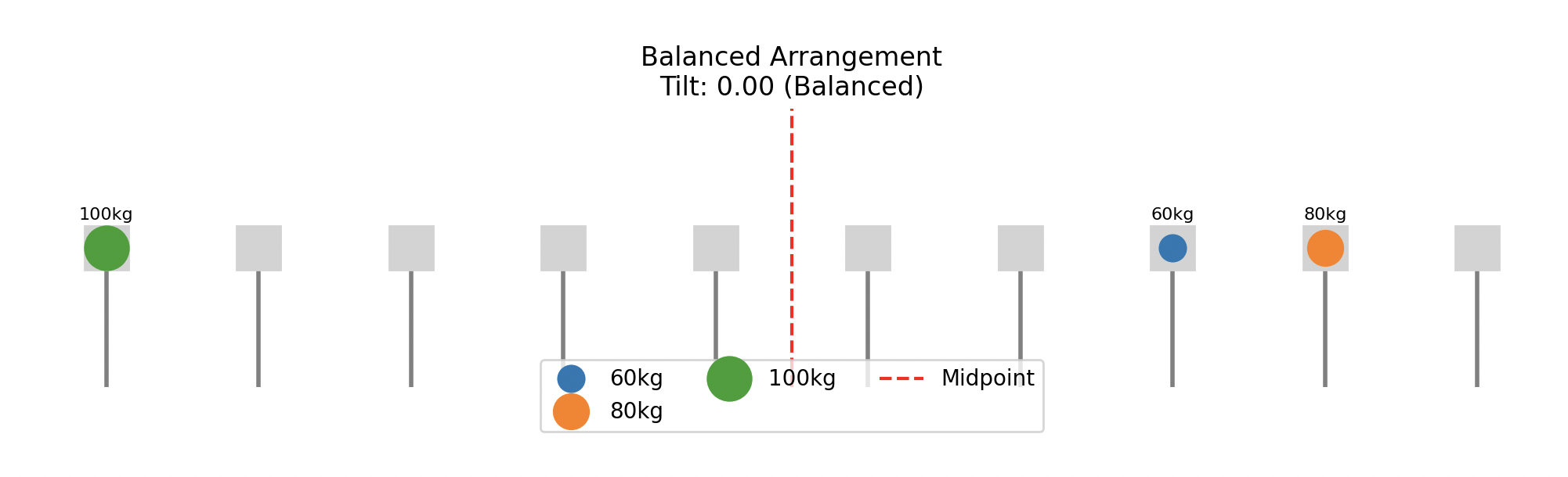 I wrote a Python class LiftTilt that calculates the net tilt on a chairlift, given a list of seat positions and weights. It simulates the moments acting around the midpoint of the chair to see whether the distribution of weight causes a tilt to the left, right, or remains balanced.
